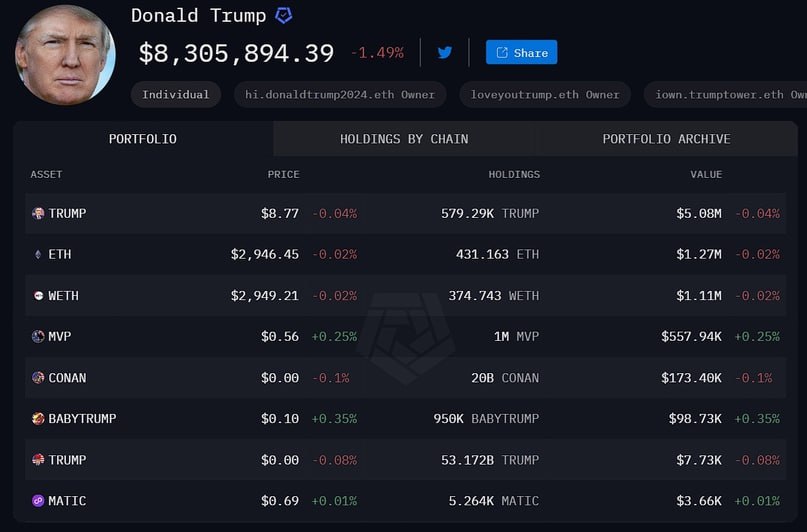 Теперь его стоимость превышает $5 млн. Помимо TRUMP, на кошельке есть и другие мемкоины: